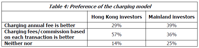 More Hong Kong fund investors prefer a commission-based model over a fee-based one, with 57% indicating so. Mainland investors’ views are mixed, with a slightly higher percentage opting for a fee-based model. (Table 4)